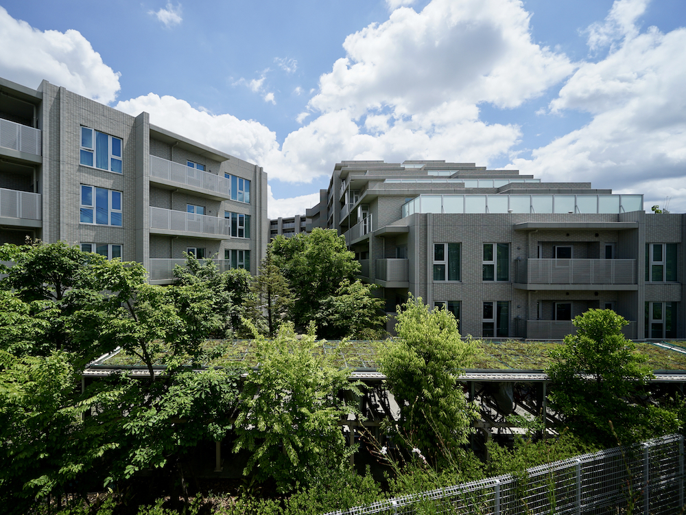 (写真)駐輪場の屋根まで緑化された敷地内共用部分