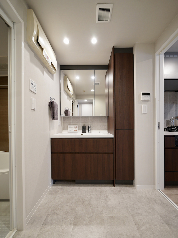 ダークブラウンの木目が美しい洗面台には、天井まで高さのある収納が備わり、タオルなどの嵩張るアイテムも整理して収めることができるでしょう。