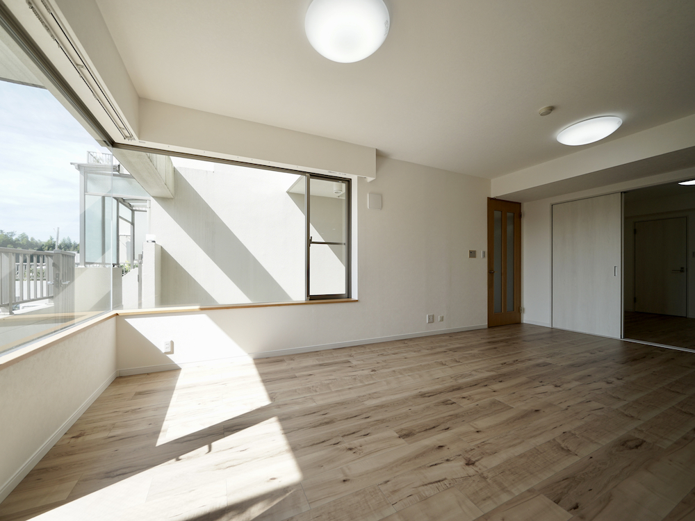 南面に巨大なコーナーサッシが設けられ、その先へと視界が抜けるため、広々と、開放的な雰囲気です。
