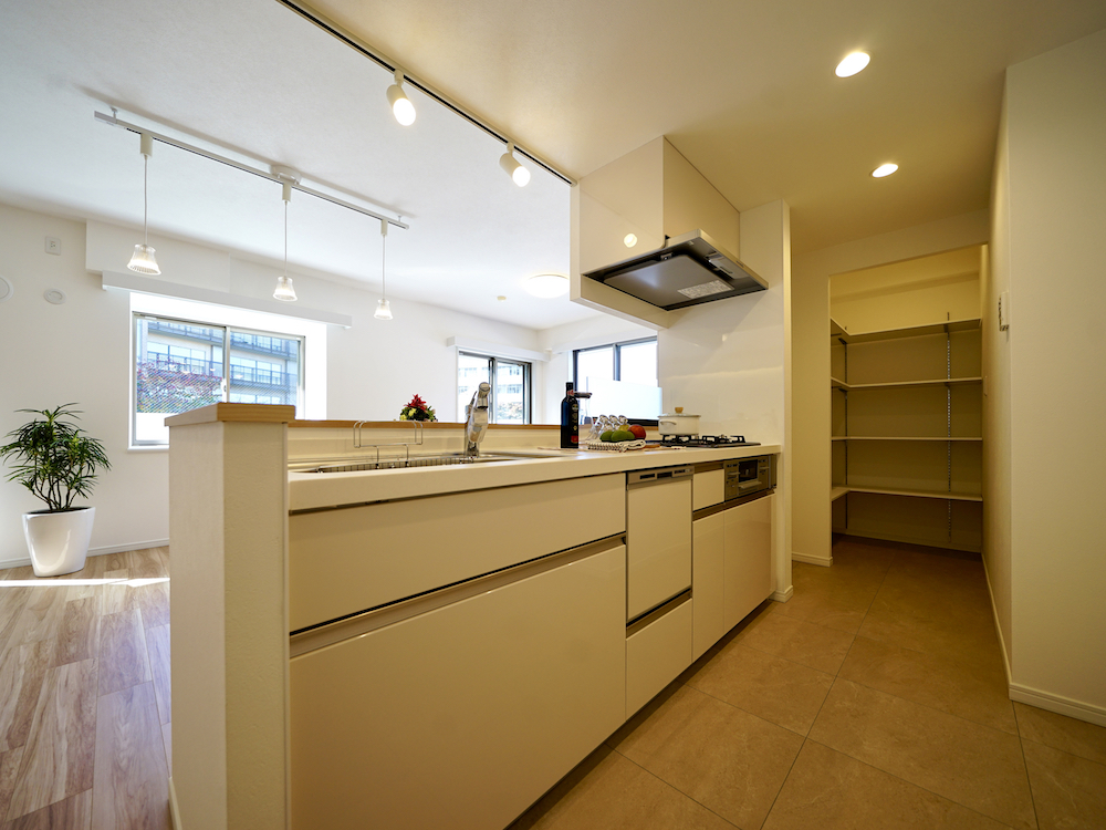 対面式のオープンキッチンは、リビングダイニングと空間が一体化し、明るく、開放感のある雰囲気です。