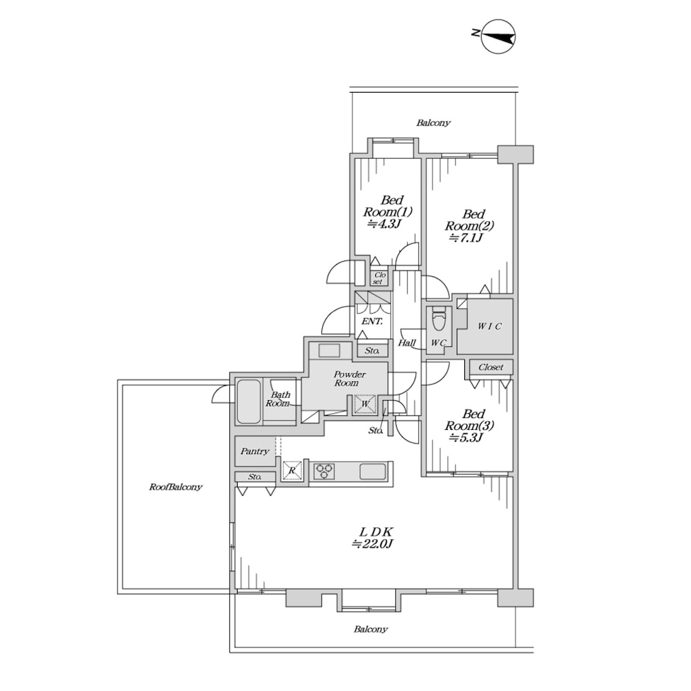 大きなルーフバルコニーと2つのバルコニーで三方を囲まれた、約88㎡の最上階角部屋です。玄関、キッチン、洗面室、寝室の広い収納スペースや水回りの窓など、快適で、美しい暮らしが実現するお部屋です。