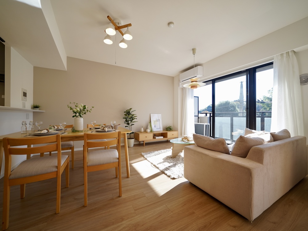 ホワイトのクロスにアイボリーのフローリングを合わせた、ナチュラルで、優しい印象の空間が広がります。