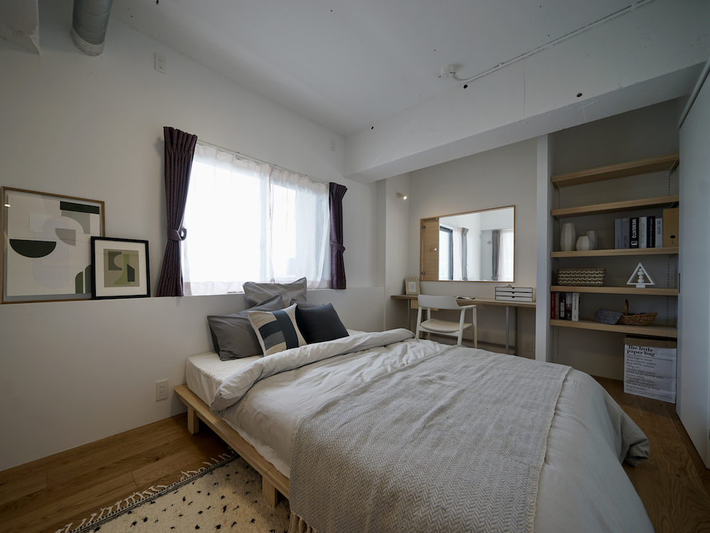 クローゼットとシェルフも備わるため、収納面でも安心です。