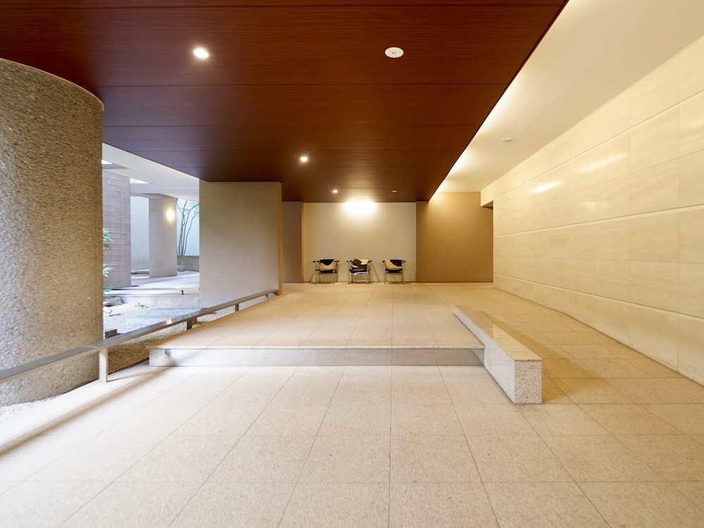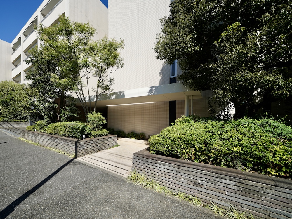 緑豊かな植栽と長い庇に覆われたアプローチの奥に、ひっそりと設計されたエントランスが邸宅のような雰囲気です。