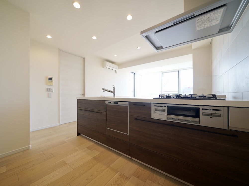 食洗機に加え、浄水器内蔵の水栓やスリムレンジフードなど、最新機能も搭載されています。