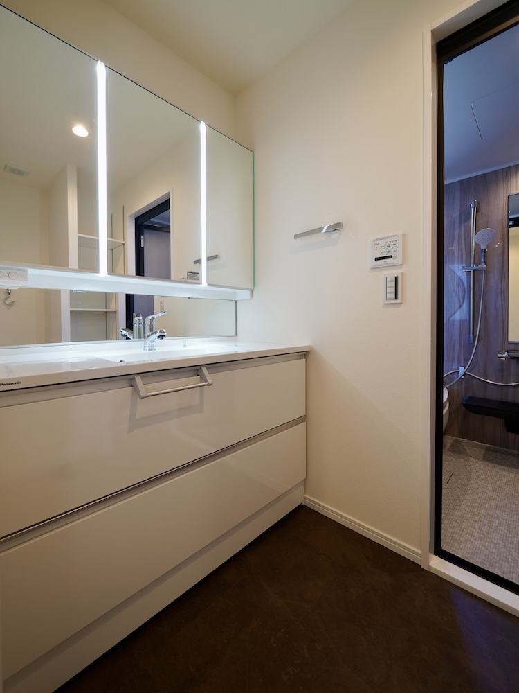 大きな三面鏡や幅広のカウンター、顔全体を照らす「ツインライン照明」など、使い勝手の良い機能が盛り込まれた仕様です。
