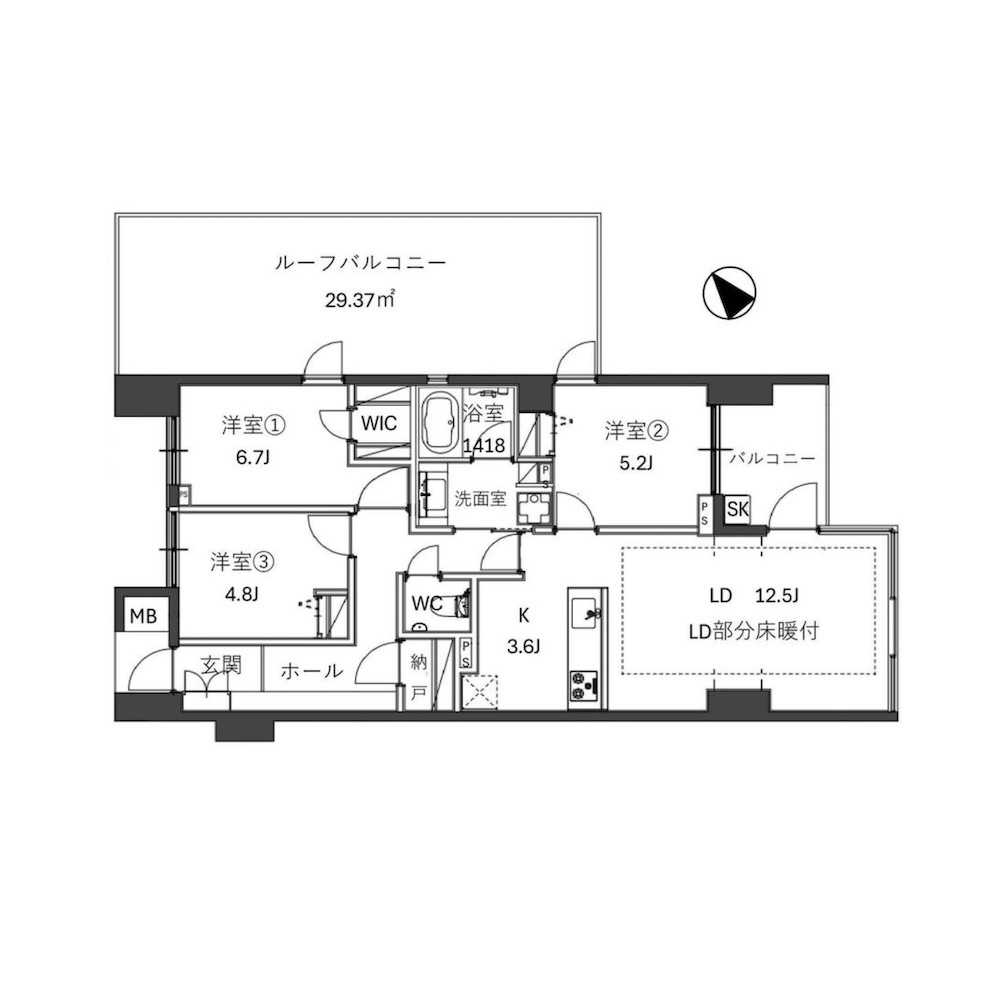 広さ74.80㎡+バルコニー・ルーフバルコニー35.17㎡