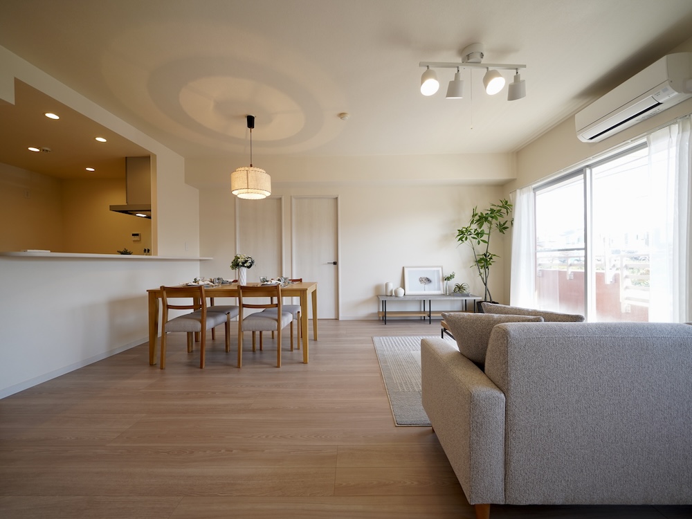 キッチンカウンターにダイニングテーブルを寄せれば、10畳を超える広いリビングスペースが残り、大きなソファでゆったりくつろぐことができるでしょう。