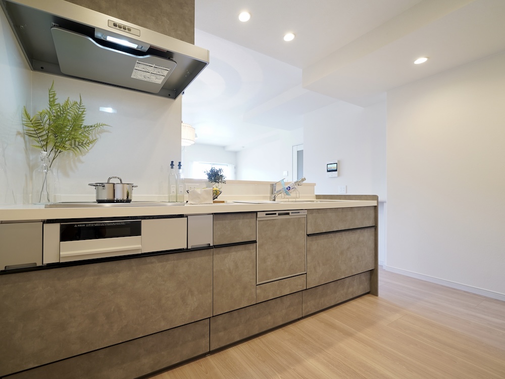 グレースタッコの美しいシステムキッチンは、浄水器や食洗機など、高い機能を備えた最新設備です。