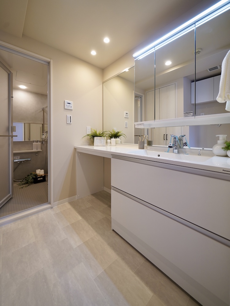 洗面台一体型カウンターには、お気に入りのスツールをセットして、憧れのドレッサースタイルに仕上げましょう。