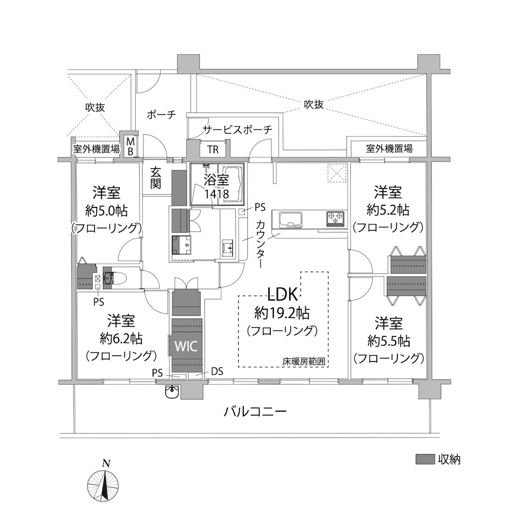 90㎡超の4LDKに、20㎡超の広いバルコニーが備わる、ゆとりある間取り。南面ワイドスパンの日当たりと北面吹き抜けの安心感で、家族がのびのびと暮らせる住まいです。