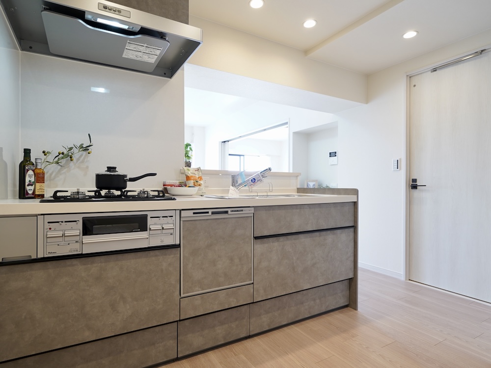 新規に設置されたシステムキッチンは、グレースタッコの瀟洒な佇まい。