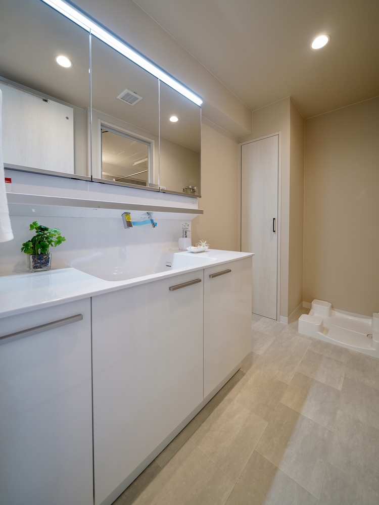 大きなリネン庫が用意されているほか、三面鏡裏にも日用品をストックできるので、美しい状態が維持できると思います。