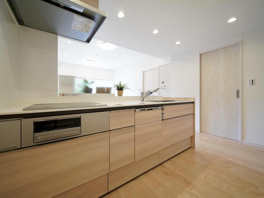 木目が美しく、ナチュラルな風合いのキャビネットや、ホワイトで統一された、継ぎ目のない人大シンクなど、キッチンに立つのがどんどん好きになりそうな仕様が詰まっています。