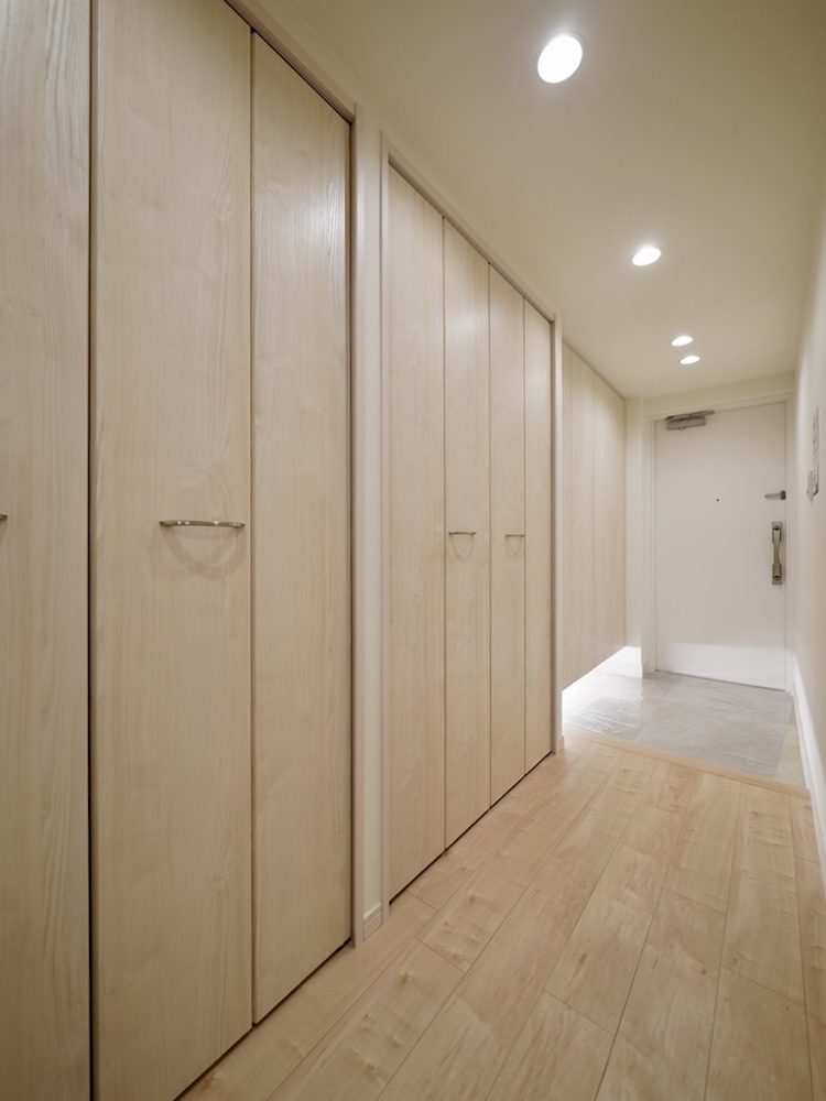 天井まで高さのあるシューズボックスの続きに、なんとふたつの大きな廊下収納を用意。