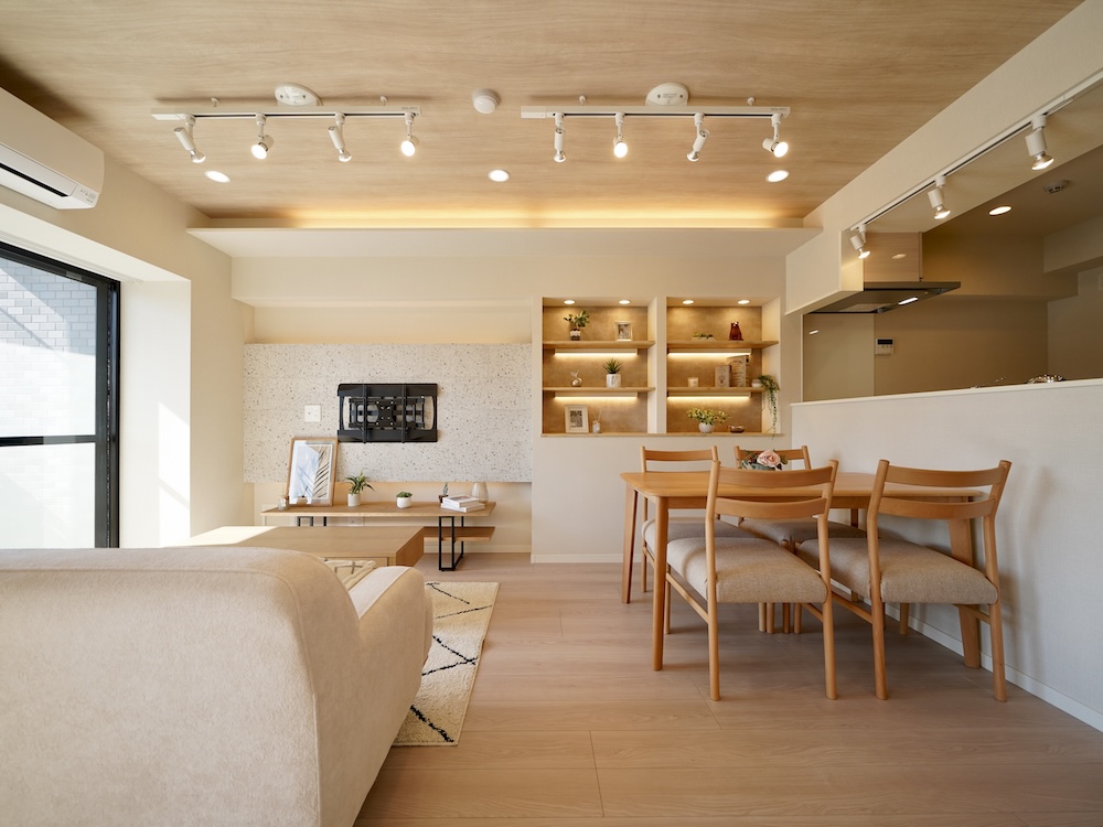 ダクトレールに並ぶホワイトのスポットライトも印象的で、照明を変えることで、雰囲気のアレンジも楽しめそうです。