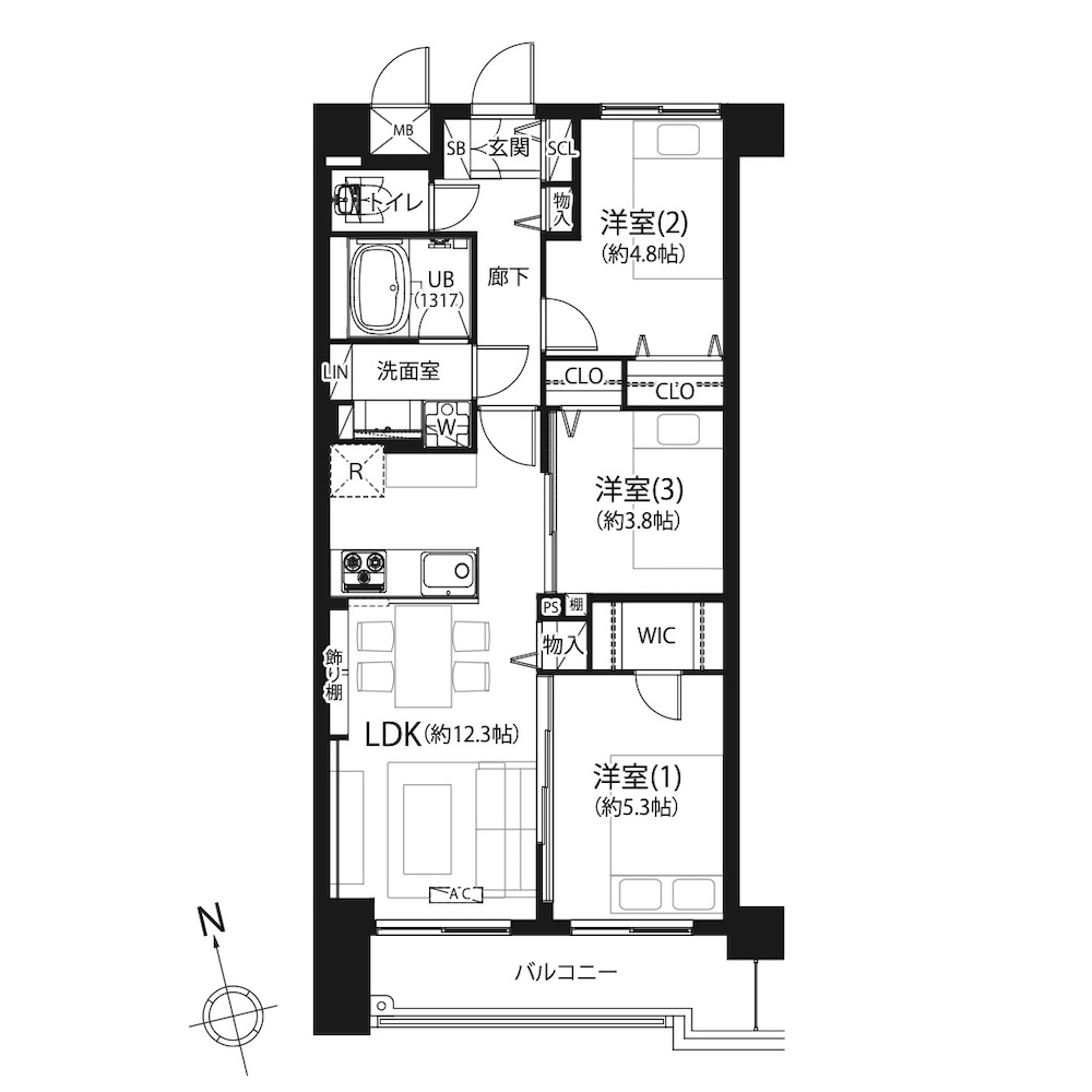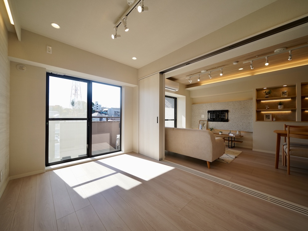 60.5㎡のコンパクトな3LDKに、シェルフや家具、エアコンがセットされたコージーな部屋。バルコニー前面の視界が大きく開けた、明るく、開放的な雰囲気もポイントです。