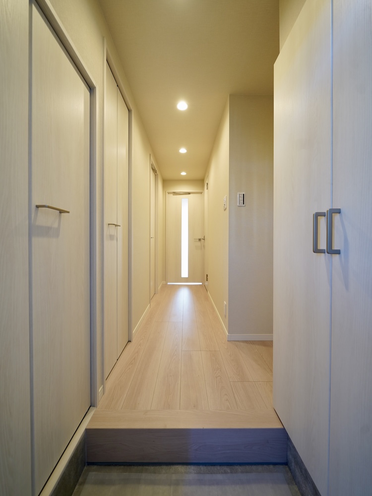 約60㎡の面積ながら、両側のシューズクロゼットの続きに物入れまで備えた、収納力の高い設計です。