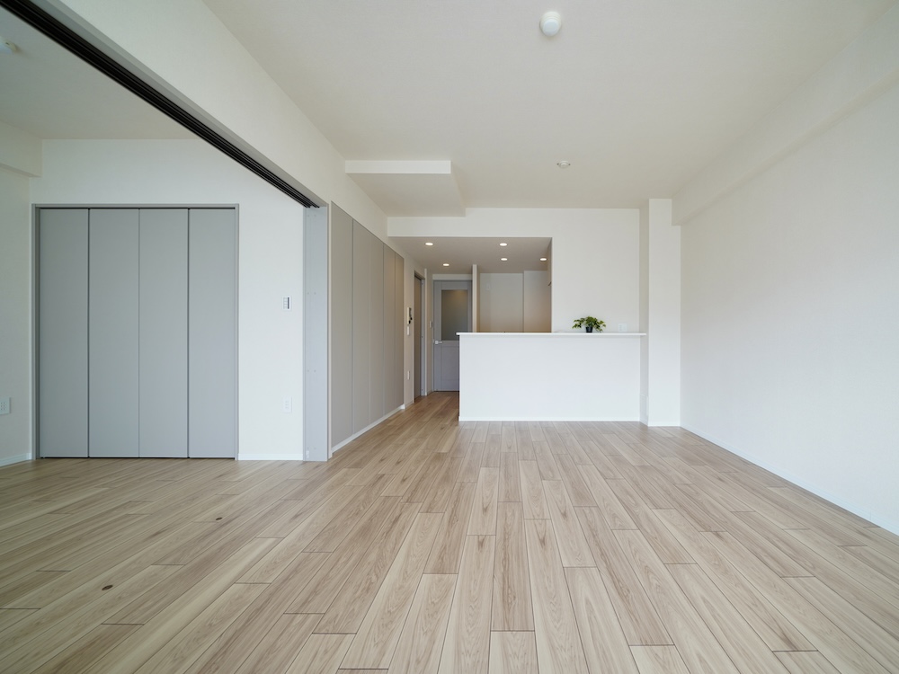 グレージュの建具と質感あるフローリングが馴染み、品のあるインテリアが完成しています。