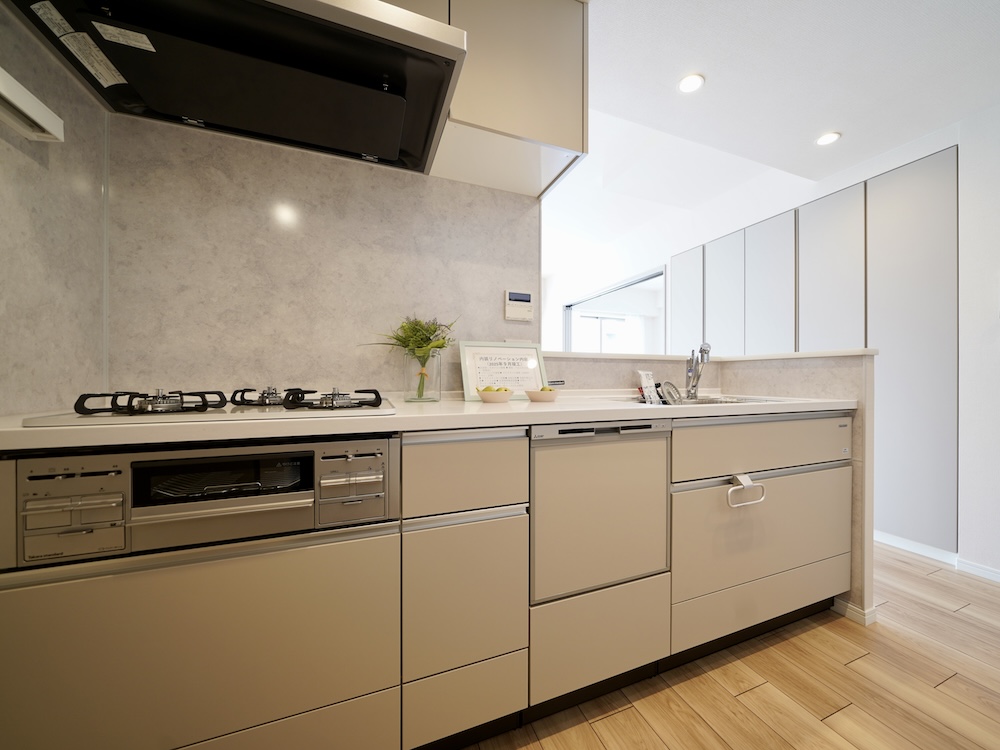 マットなグレージュが美しいシステムキッチンは、食洗機や人造大理石カウンターなどを備えた最新仕様。