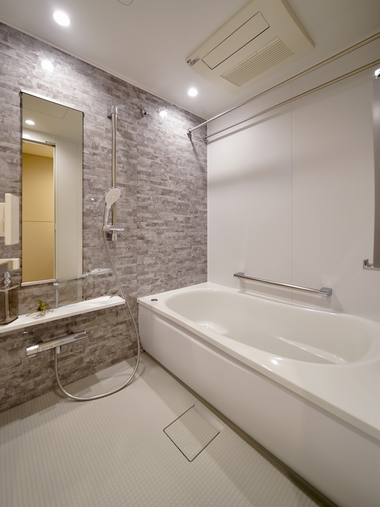 浴室は石目調パネルを採用した、高級感あるインテリア。