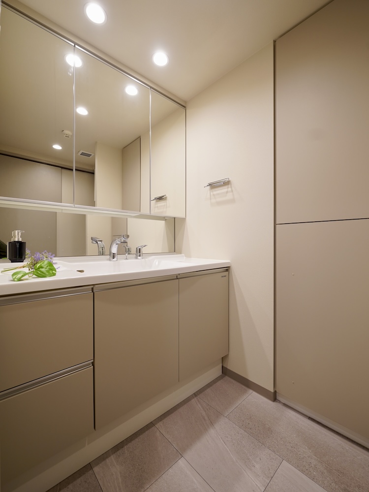 幅広の洗面台にセットされた大きなキャビネットに加え、天井まで高さのある大きなリネン庫が設計されています。