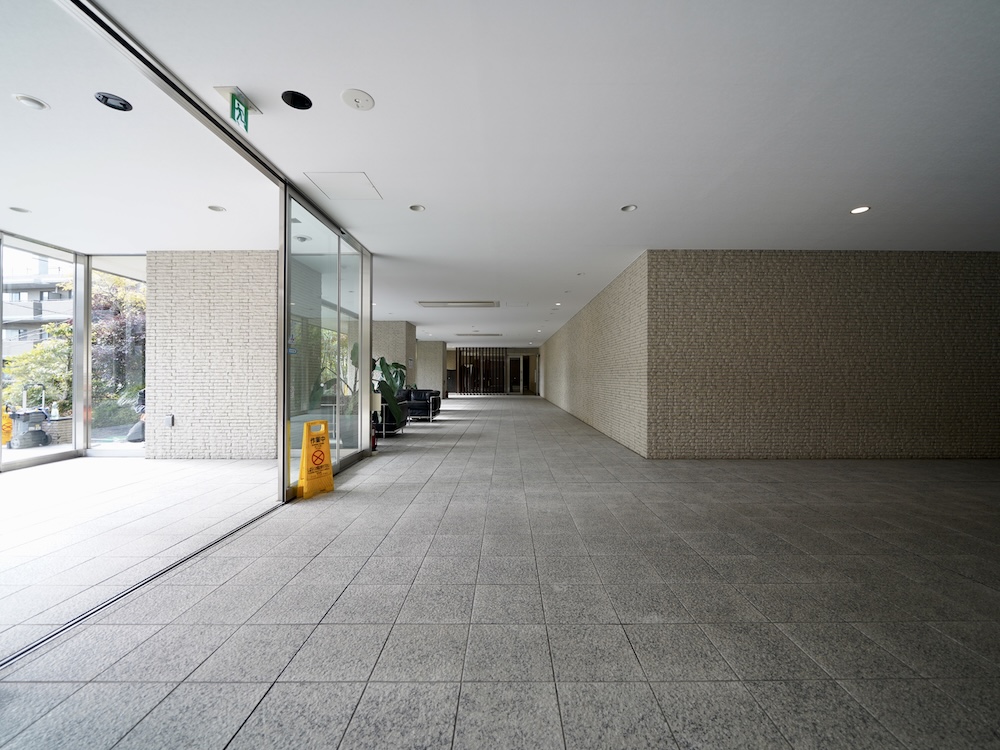 大きなガラス張りの扉や質の良い天然石の床など、すべてが格調高く、ハイグレードの暮らしを想像させる佇まいです。