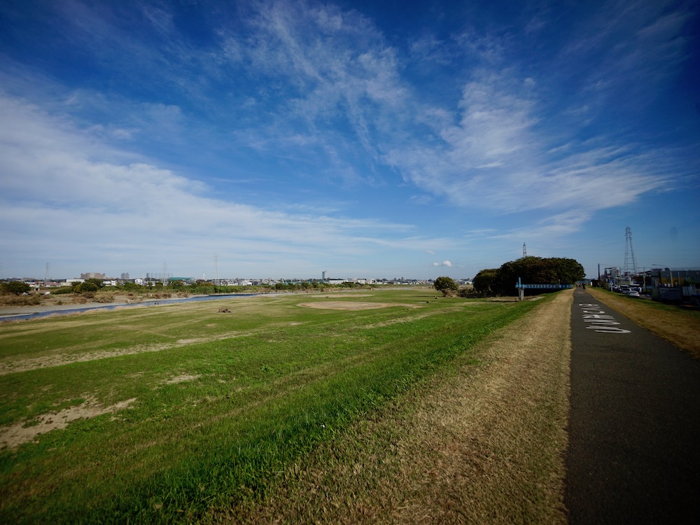 ゆるやかに流れる多摩川の河川敷では、多くのランナーやサイクリスト、ペットを連れて散歩をする人が、豊かな緑とのんびりとした雰囲気を味わっています。