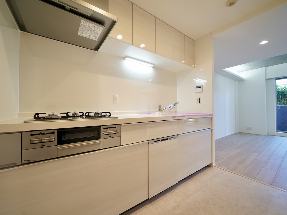 壁付きのキッチンは、上下に収納が確保された、使い勝手の良い仕様。