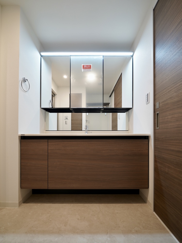 木目調パネルとワイドミラーが上質な雰囲気を演出し、一日の疲れをゆっくり癒せる、落ち着いた空間に仕上がっています。