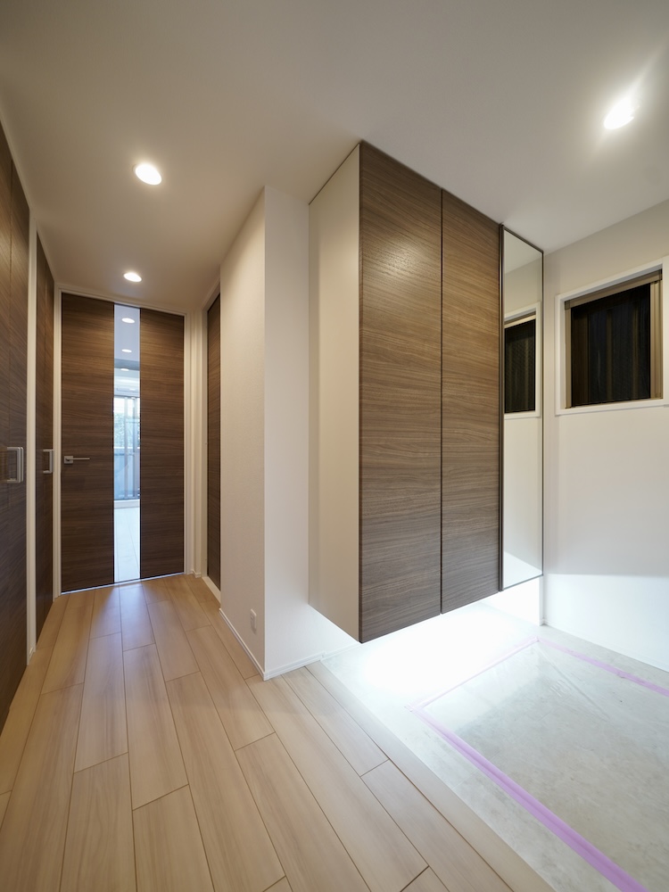 ブラウンのグラデーションで構成された、品のある玄関スペース。