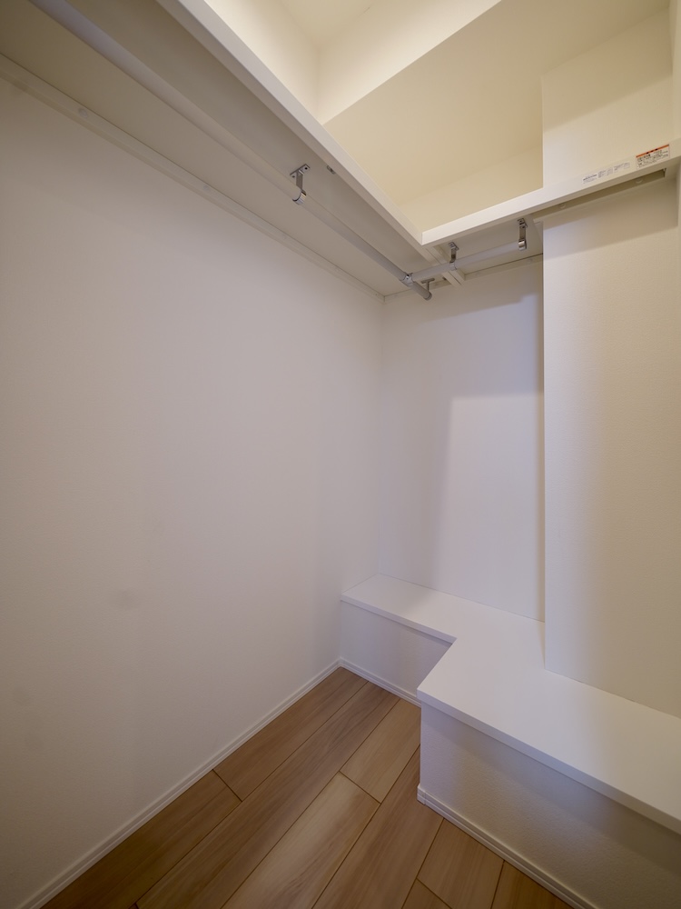 ウォークインクロゼットには、衣類はもちろん、季節の家電や旅行バッグもまとめて収納。