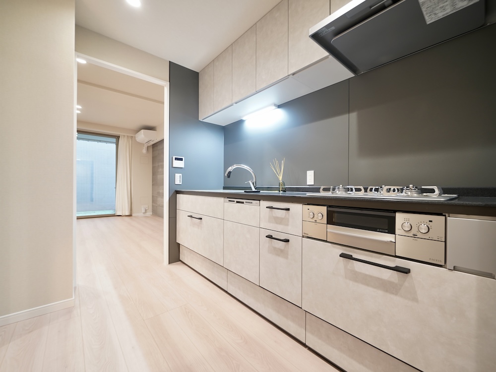 対面ではない代わりに、頭上に豊富な吊り戸収納が備わります。