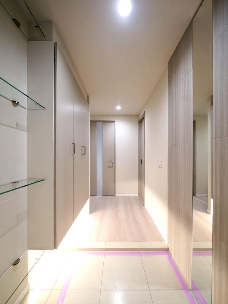 中のホールには、2脚のレザーチェアが静かに置かれ、大きな余白が大人の風格を漂わせます。