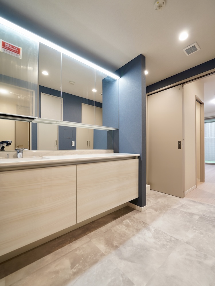 袖壁のペールブルーが、おしゃれゴコロをくすぐるサニタリー。