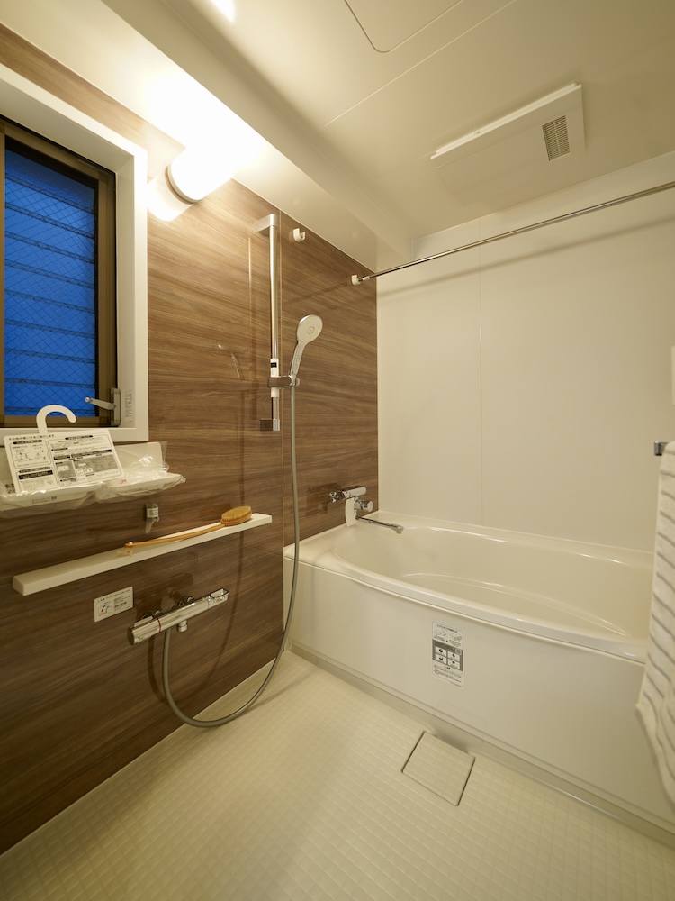 木目調パネルがかわいらしい雰囲気のバスルーム。