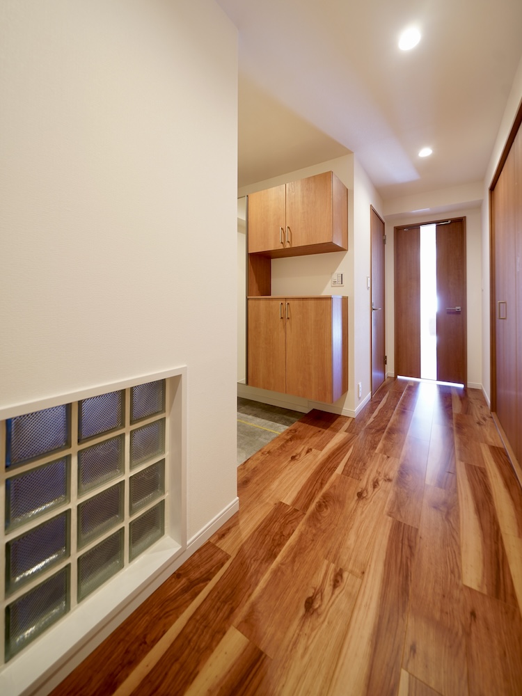 壁面にあしらわれたガラスブロックが光を取り込みつつ、空間のアクセントとして、さりげないデザイン性を添えています。