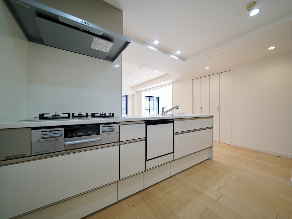 掃除が楽な人大カウンターやスリムなフラットレンジフードのほか、食洗機や浄水器一体水栓など、高い機能も盛り込まれています。