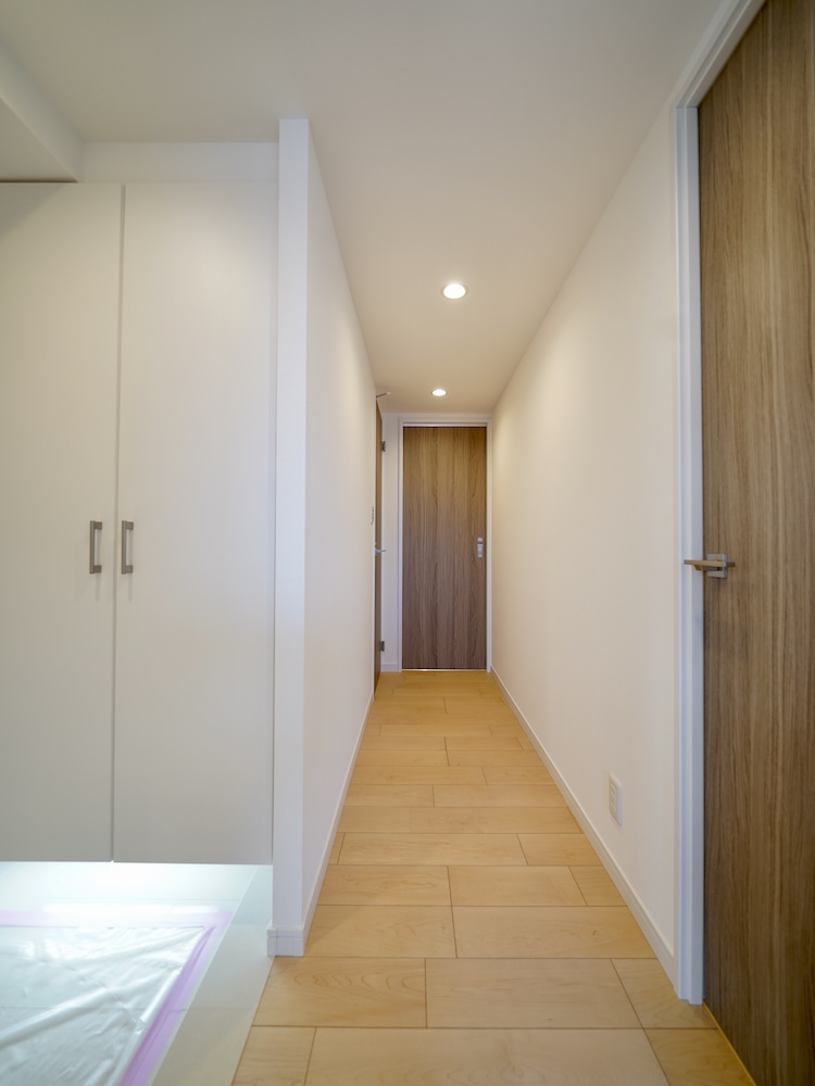 大理石調の玄関タイルに、メイプル色のフローリングが調和した空間は、明るく、清潔感にあふれています。