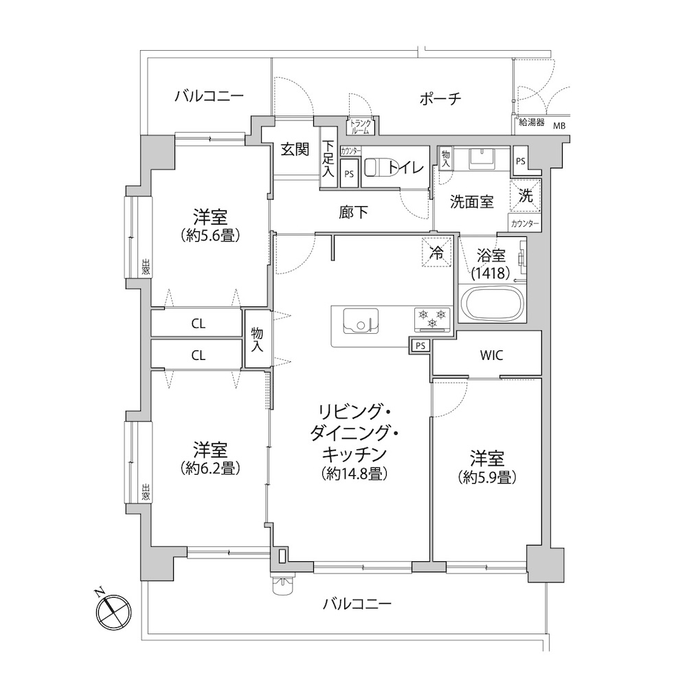 リビングダイニングは、キッチンを合わせて14.8畳。
