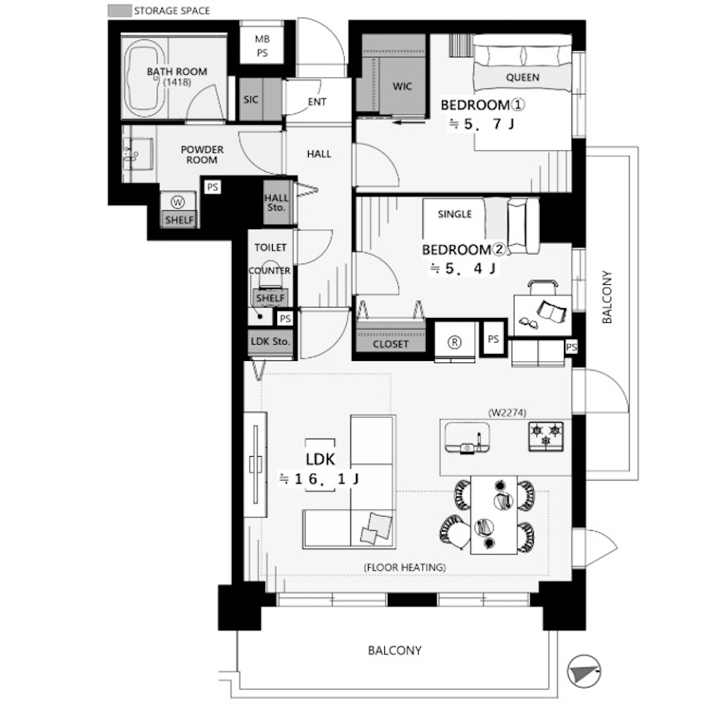 3人家族にジャストサイズな、64㎡の2LDK。二方向の窓から光と風を取り入れる16畳超のLDKや、1418サイズのゆったりとしたバスルーム、各所に備わる豊富な収納スペースがみどころです。