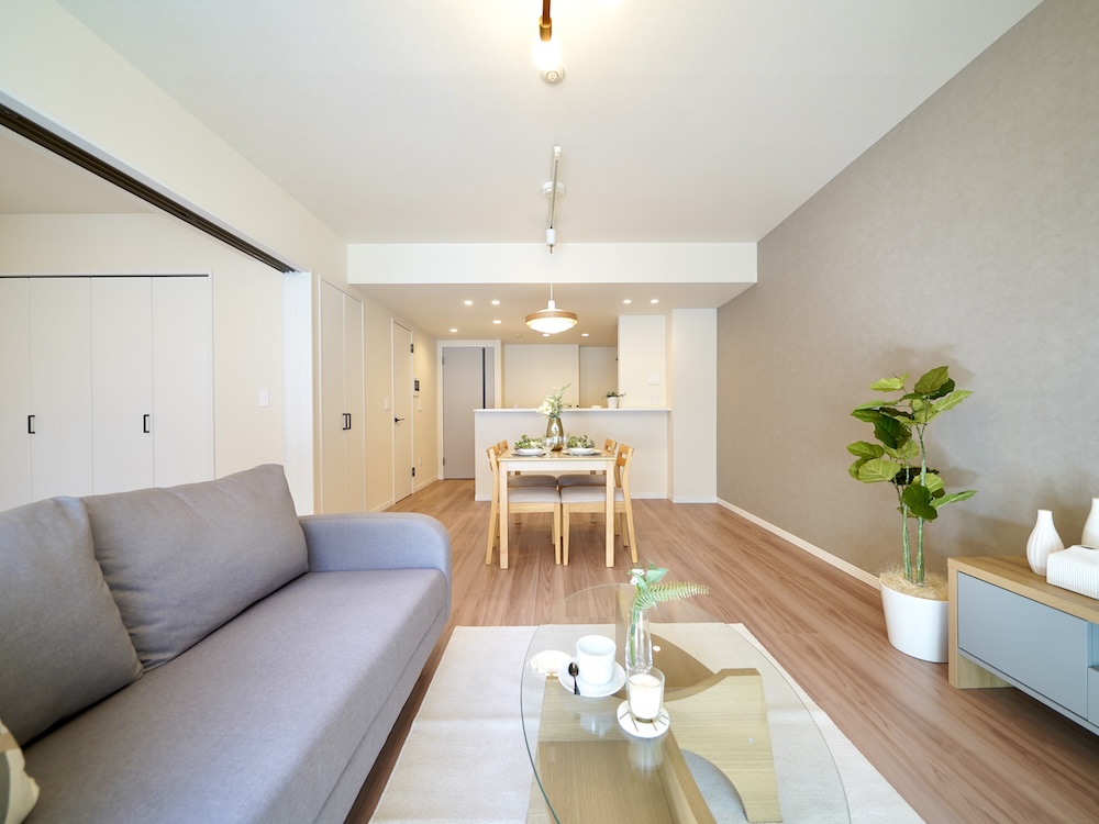 キッチンカウンターにダイニングテーブルを寄せれば、8畳ほどの広いリビングスペースが残り、大きなソファでゆったりくつろぐことができるでしょう。