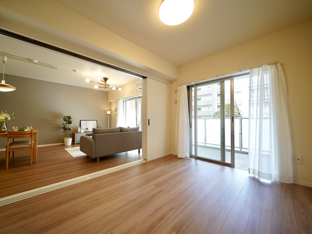 窓の先に広いバルコニーが続くため、明るく、開放的な空間が広がります。
