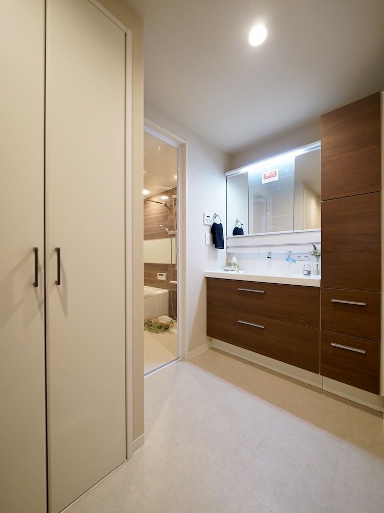 サイドキャビネットに加えて、大きなリネン庫が用意されているため、タオルや日用品も余裕をもって収納することができるでしょう。