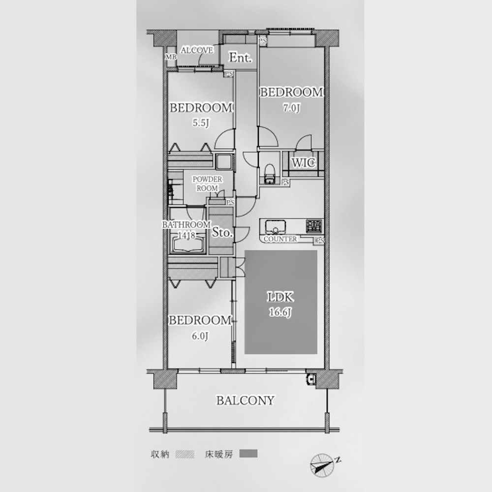◎80㎡超のゆとりある3LDKには、豊富な収納と最新の設備が備わります。南東が中庭に面した、明るく、静かな環境の中、グレージュトーンの美しい暮らしを楽しめます。