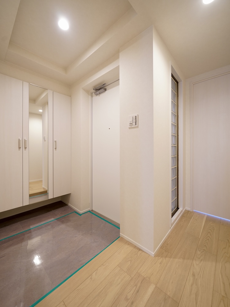 大きな一枚ガラスから、たっぷりと光を取り入れるエントランスホール。