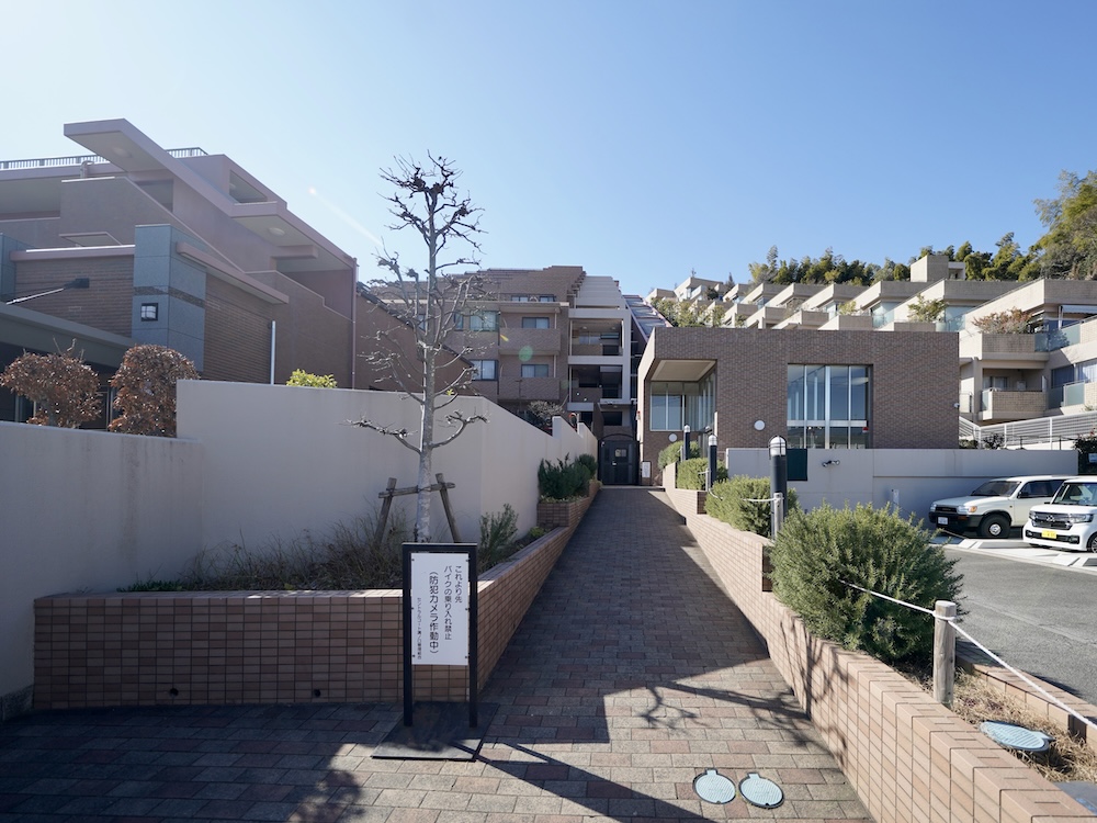 ひな壇を斜行エレベーターで上がる、リゾートのような物件。75㎡超のゆとりある3LDKで、メイプルとホワイトの美しいインテリアとハイグレード設備のリノベーションもみどころです。
