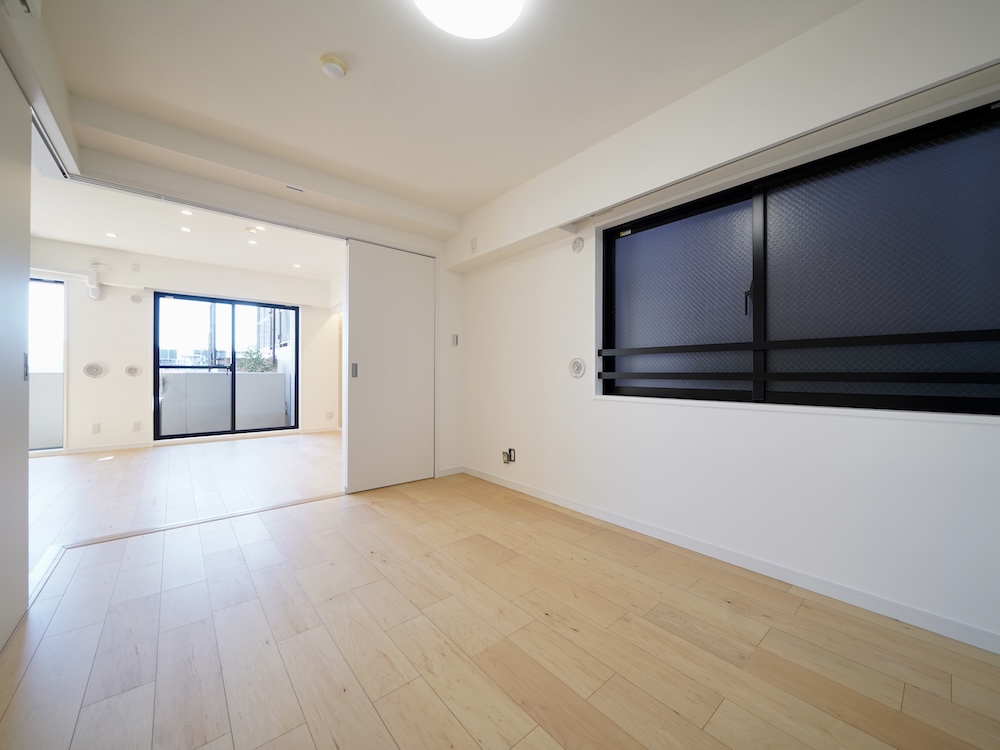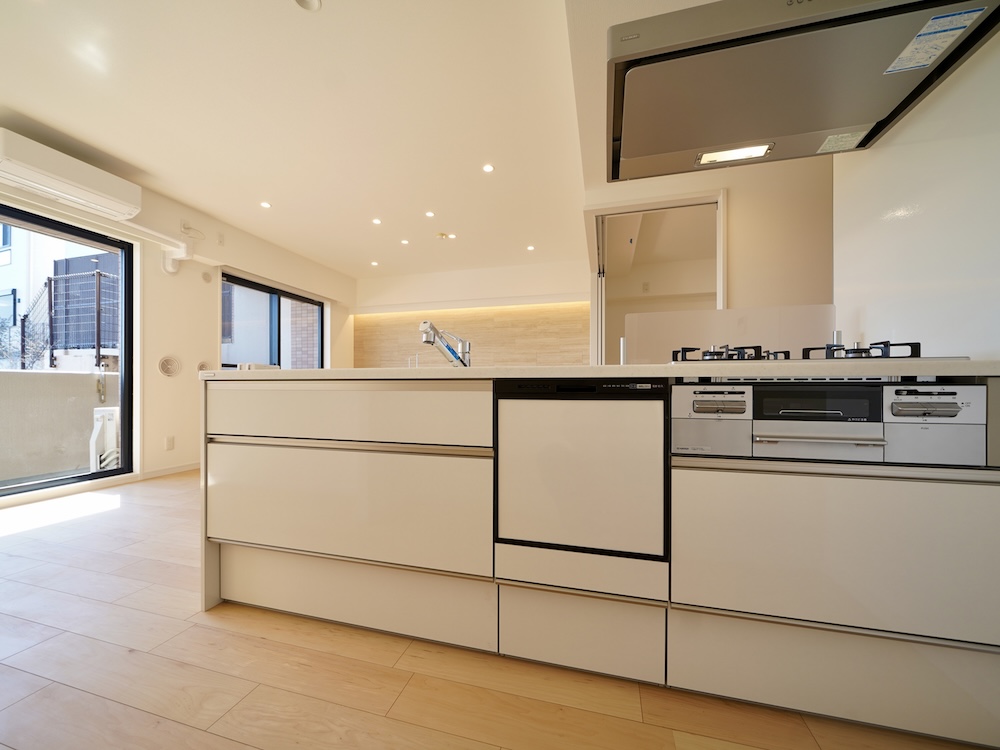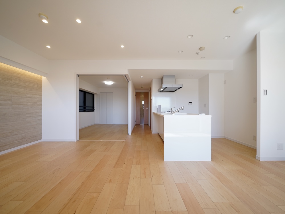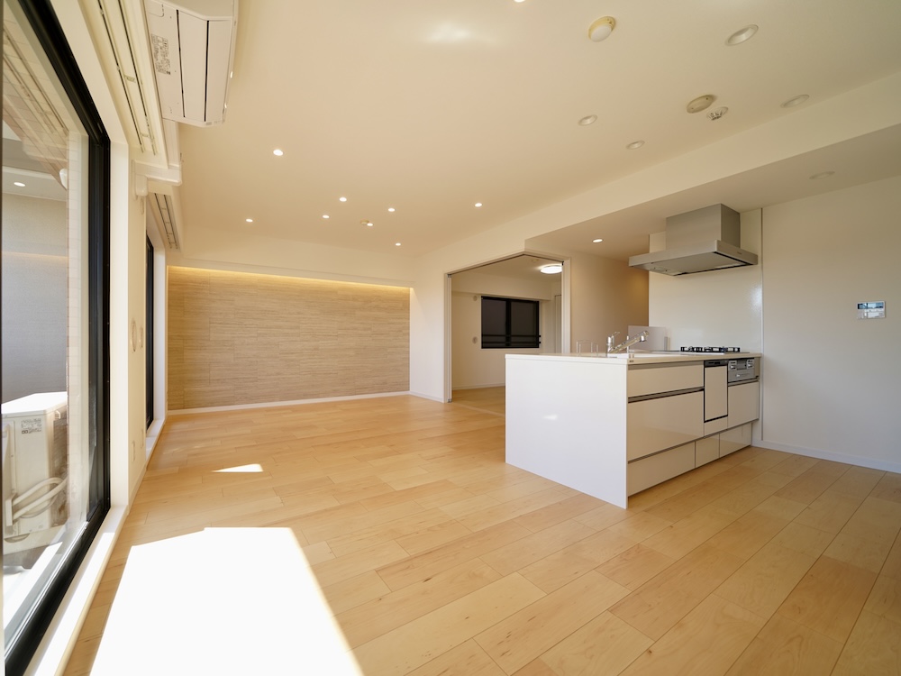 みずみずしいメイプルの突板フローリングと、堂々と鎮座する純白のシステムキッチンが、この物件のグレードの高さを物語っているように感じます。