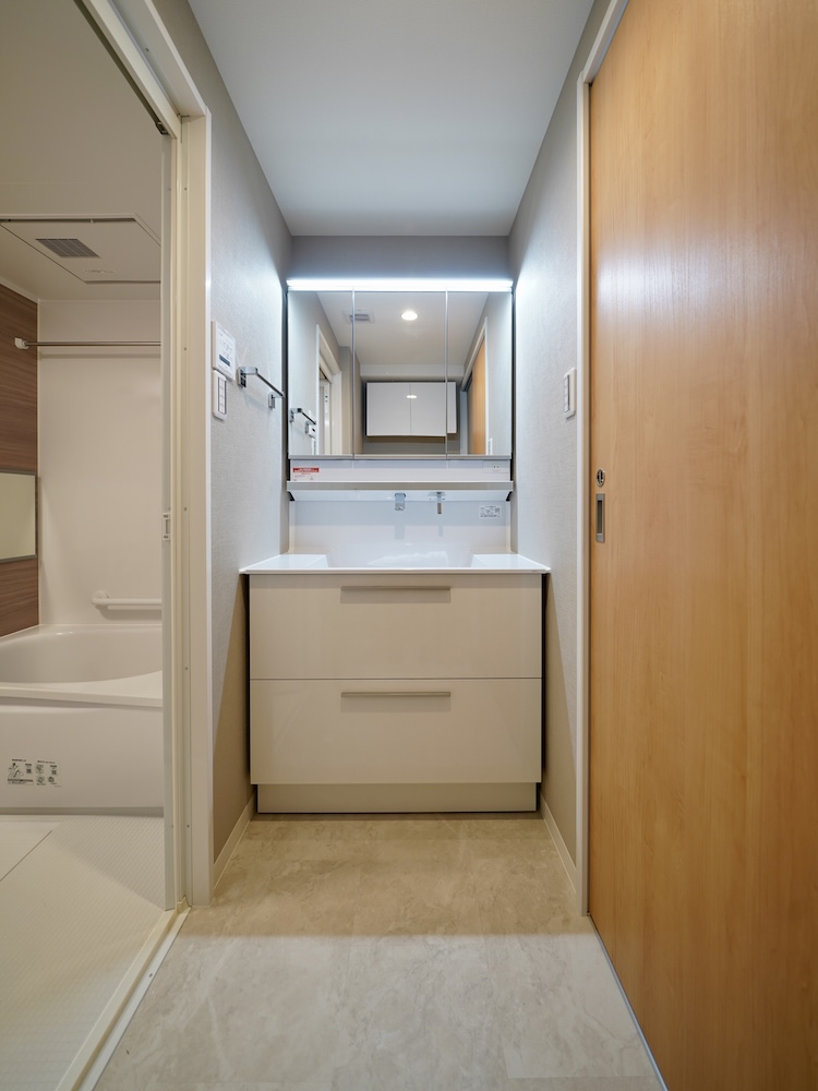 シンプルな洗面台は、二段の引き出しに三面鏡裏収納が加わり、散らかりがちな洗面周りを美しく保つことができそうです。