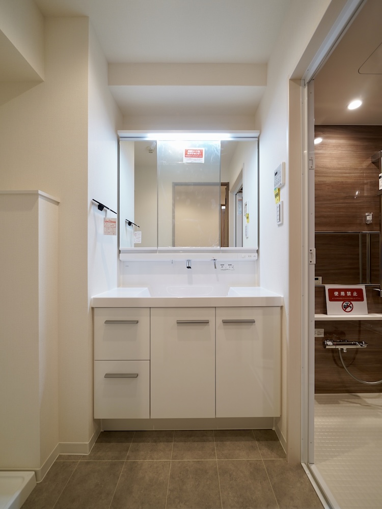大容量のキャビネットに加え、三面鏡裏にも収納が付いているため、家族それぞれの小物を整理して使うことができるはず。